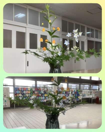 さて、学校元気アップの活動の一環で、お花を生け替えていただきました。玄関ホールには「サンダーソニア・デルフィニュウム・もみじ」、職員室前には「デルフィニュウム・もみじ」です。いつも東中生のためにありがとうございます。
