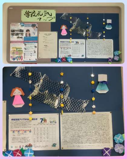 また、今日は、七夕。図書室前の「学校元気アップからのお知らせ」の掲示板が、天の川(Milky Way)・ベガ(織姫星)・アルタイル(夏彦星)がモチーフになっています。いつも東中生のためにありがとうございます。