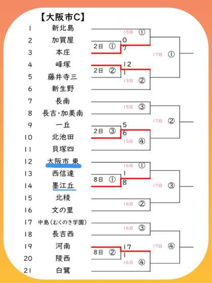 大会初戦(2回戦)は、7月16日(日)第一試合(8時30分開始予定)、会場は長吉西中学校(平野区)、対戦チームは墨江丘中学校(住吉区)になりました。