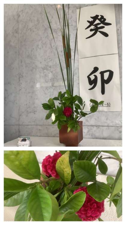 玄関ホールのお花を生け替えていただきました。お題は「白のかおり」、お花は「ガマ・鶏頭・くちなし」です。いつも東中生のためにありがとうございます。