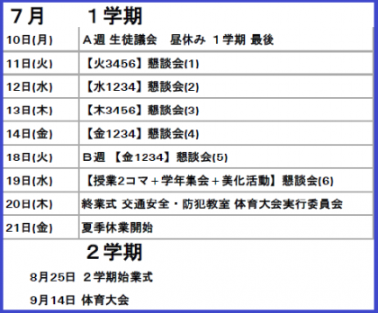 明日から懇談です。『少し立ち止まって、1学期を振り返り、夏休みの予定を立ててみましょう。』(副校長先生 講話より)