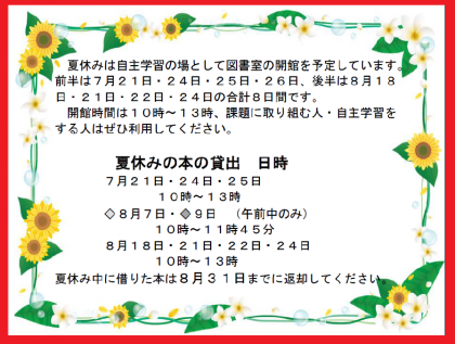 今年の夏は、夏祭り・花火大会・盆踊りなど色々な行事も復活し、楽しい夏になりそうですね。全力で遊ぶには、クラブ活動や夏休みの課題・学習の計画をしっかり立てて実行してね。課題は提出期日を守るのが大事ですよ。