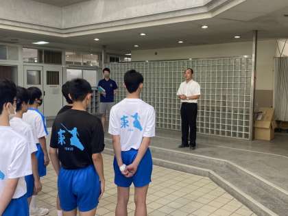 今日は男子団体戦の二回戦までが、明日は三回戦以降と、女子の試合が行われます。写真は、昨日の練習の様子と、ミーティングで校長先生からの激励を受ける様子です。