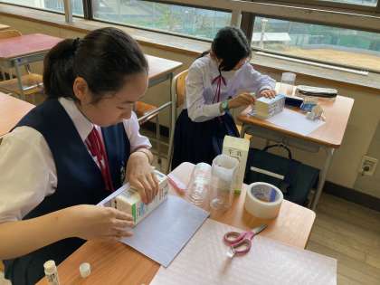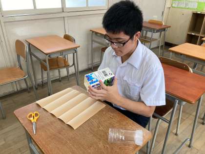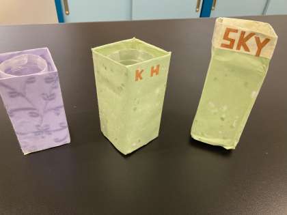 「花器になるものをSDGsの観点から作れないかな?」と考え、ペットボトルと牛乳パックで花瓶を作りました。牛乳パックの外側は和紙で飾っています。