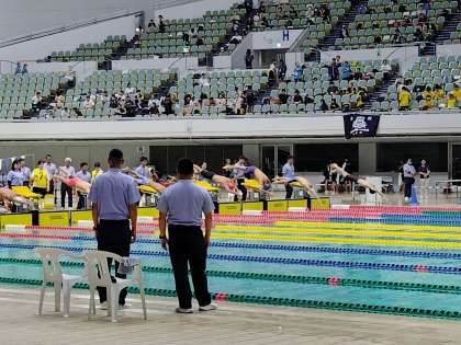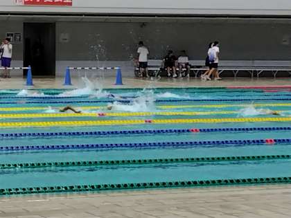 本日もラクタブドームで大阪府大会です。フリーリレーと400m自由形に出場します。午前中に行われたフリーリレー予選では、惜しくも決勝進出はできませんでしたが、タイムを10秒以上上げてベストタイムを出しました。
