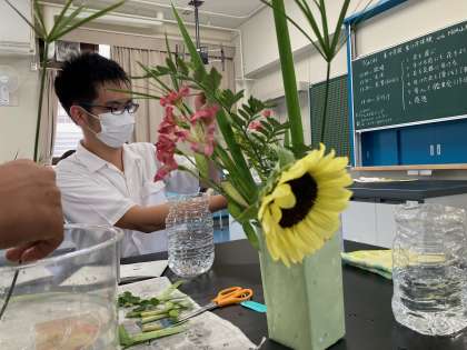 今日はMOA山月光輪花の皆様をお招きし、生花体験を行いました。事前に作成した、ペットボトルと牛乳パックから作った花器を使って、花を「さす」体験をしました。