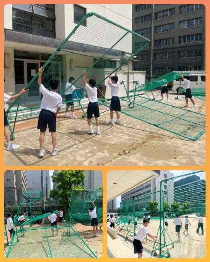 男子バスケットボール部の皆さんが、練習後に、台風に備えて倒していたグランドのネットを戻してくれました。