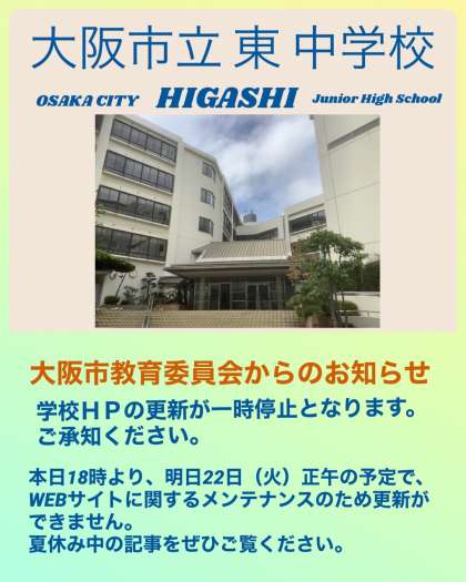 さて、本日18時から明日正午の予定でメンテナンスのため、このホームページが一時的に更新できません。ご承知ください。また、この機会に、夏休み中の記事をぜひご覧ください。