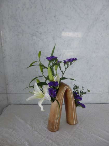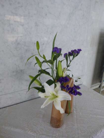 カサブランカの白とスターチスの紫とのコントラストが美しく、秋の深みが感じられるような作品です。反対側にも、スターチスとユーカリが可愛らしく覗いています。(逆光で申し訳ありません。)