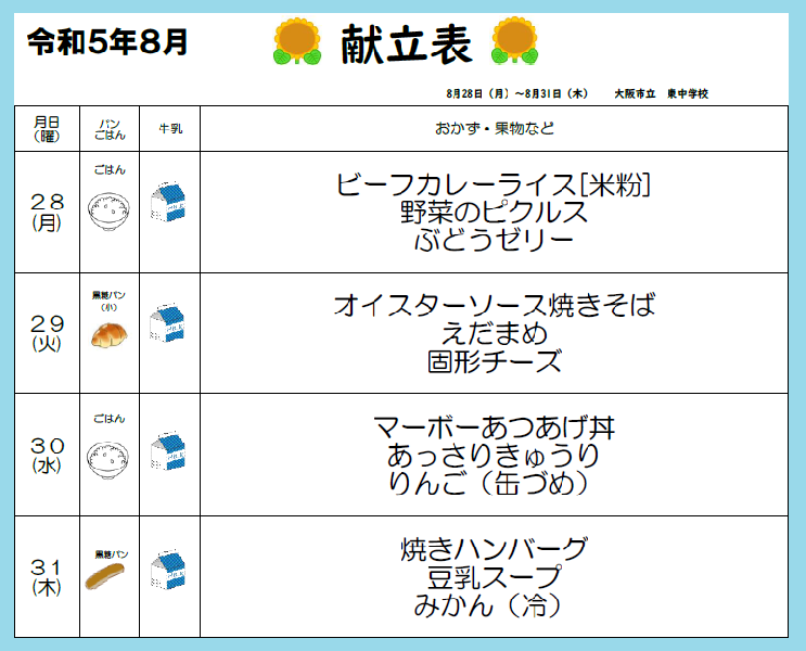 給食が始まります。〜8・9月 献立表を掲載します〜