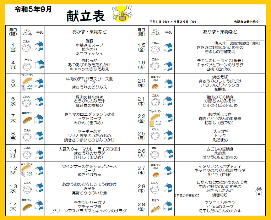 各自でランチョンマットの用意をお願いします。また、給食当番の人は、エプロンと三角巾(バンダナでも可)の用意もお願いします。バイキング方式で配膳していますので、配膳時のマスクの着用もお願いします。