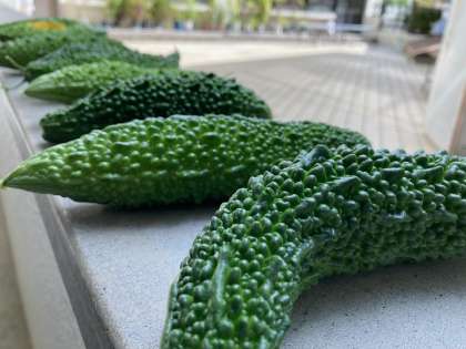 正面玄関のお花を入れ替えました。2学期の準備万端です。ゴーヤは8つ収穫できました。