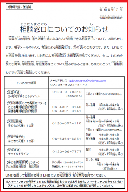 大阪市立の学校に通う生徒のみなさんが利用できる相談窓口について、お知らせします。電子メールや FAX、電話による相談窓口は、「相談窓口についてのお知らせ」のとおりです。また、LINEでも相談を受け付けています。「LINE による相談窓口 利用案内」をご覧ください。もし、いじめや友だち関係、学校生活、家庭生活などについて悩みがあるときは、あなたにとって一番相談しやすい方法で相談してください。