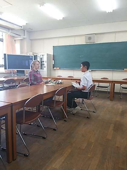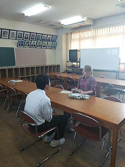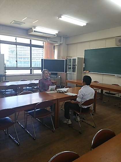 英語の授業に来ていただいているC - NETのアマンダ先生との会話中です。今日は朝から3年全クラスで実施しました。緊張した中でしたが、英語が得意な人も、苦手な人もみんな頑張りました!