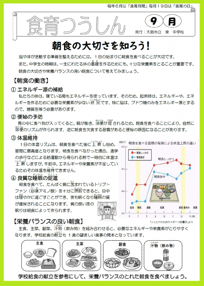 9月の「食育つうしん・給食で食を考えましょう」を掲載します