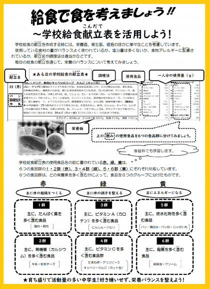 「給食で食を考えましょう」では、「学校給食献立表」の活用についての記事が掲載されています。食に関心をもって、健康な身体を維持しましょう。