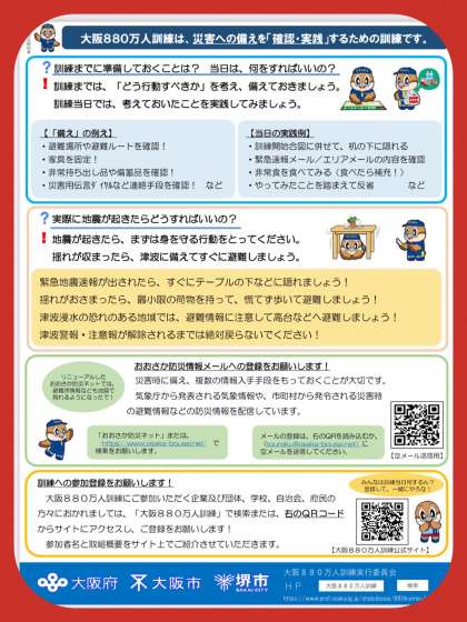 今年の大阪880万人訓練では、9月1日(金)13時30分に一斉に緊急速報メール/エリアメールで「地震発生(訓練開始)」が、13時33分には「大津波警報発表」のメールが配信されます。