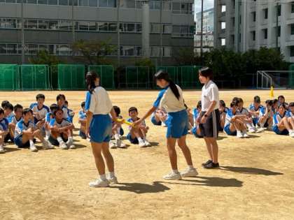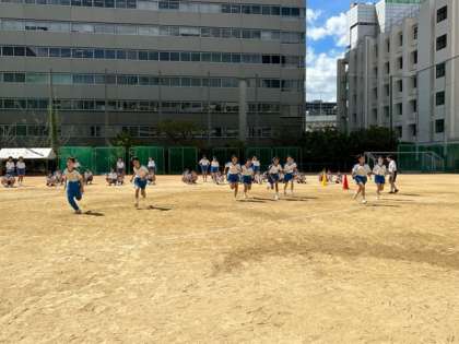 日差しの強い中、運動場で陸上競技の学習です。準備運動のあと、ジャンプやタッチをおり混ぜながらのダッシュなど楽しそうに取り組んでいました。