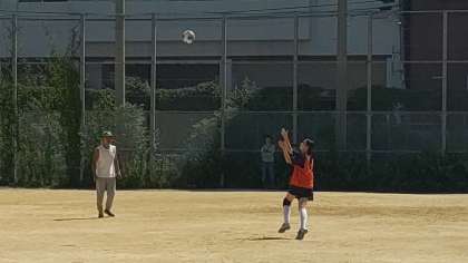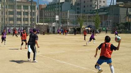 瓦屋町グラウンドで行われている中学生キックベース・ソフトボール大会。キックベースの部は、初回に得点を許し、それを追う苦しい展開でスタートしました。随所によいプレーが見られるものの、相手の気迫ある攻撃に、試合は膠着状態になり、後半に期待がかかります。