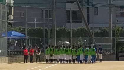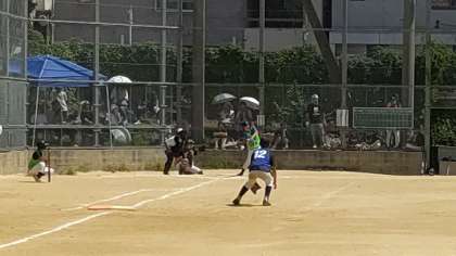 キックベースの部に引き続き、対戦相手は上町中学校になりました。選手たちは開会式後の暑い中にも、近隣で練習を欠かさず、試合に向けて入念に準備を進めていました。参ってしまいそうな暑さの中、キックベースの雪辱果たすべく、またソフトボールの部で連覇を果たすべく、気持ちのは行った挨拶で試合がスタートしました。先頭バッターを内野ゴロにうち取り、ショートを守る選手が華麗にさばいてワンアウト。リズムよい立ち上がりに、早くも投手戦を予感させる展開になりました。ところが、予想に反してその後は打撃戦に。取っては逆転され、取り返しては追い付かれる展開に。