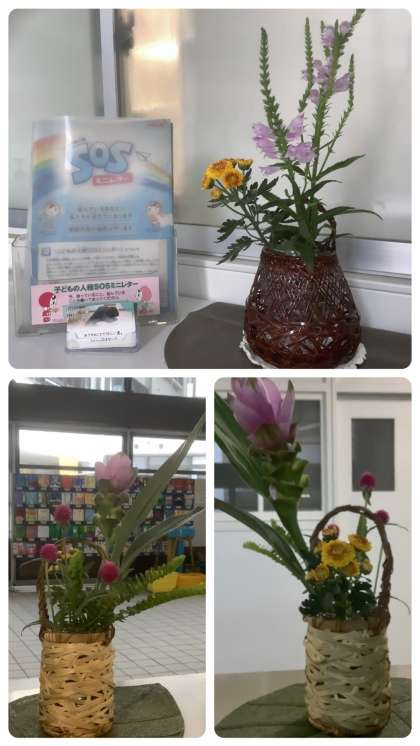 玄関(クルクマ・菊・千日紅・玉しだ)と職員室前(ハナトラノオ・菊)にお花を生けていただきました。いつも東中生のためにありがとうございます。2学期もよろしくお願いいたします。