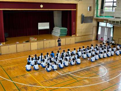体育館でリレーのバトンパスについて学びます。