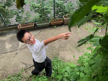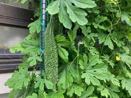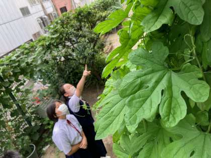 取りにくい高い位置にあるゴーヤは、建物の外側から見つけて指さします。連携プレーで、建物の内側からはゴーヤが見えませんが、外からの指示に従って、台に登って収穫します。