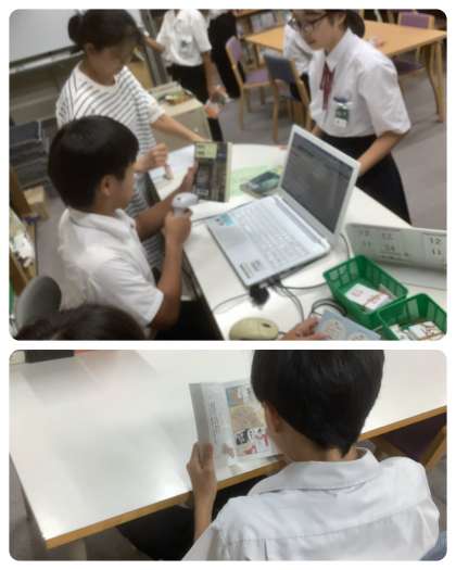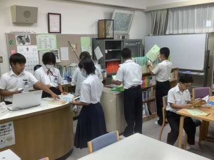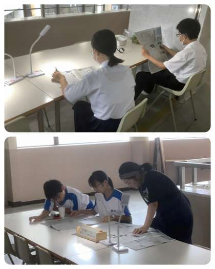 新しい本が200冊以上入荷した図書室。国語の授業での案内もあり、大盛況です。また、図書室前の新聞コーナーでは、先生も一緒に、じっくり新聞を読む生徒がいます。