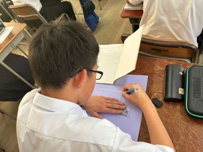 「日本の文化を英語で紹介しよう」にチャレンジしていました。プリントに下書きをして、大きな画用紙に清書していきます。