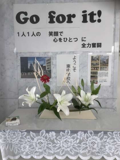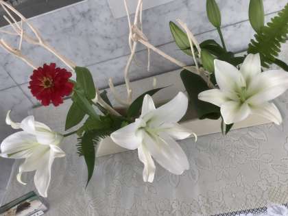 お題は「白い夏の思い出」、お花は「オリエンタルリリー・ジニア・玉しだ・葉らん・ミツマタ」です。白い大輪の花の後ろに、4つの蕾が控えています。いつも東中生のためにありがとうございます。