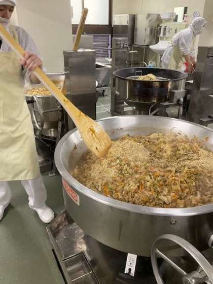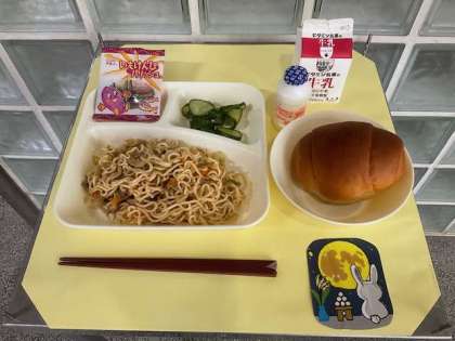 今日の給食には、具沢山の焼きそばが配食されています。いかも豚肉もはいっています。しっかり食べて、昼からの授業も頑張りましょう。