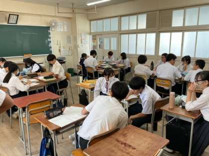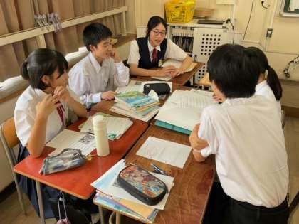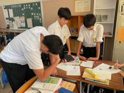 3年生の英語科の授業では、入試にも頻出の"現在分詞"を使った活動が行われていました。グループに分かれて、一人一人がジェスチャーを考えます。そのジェスチャーが何を表しているのかを、他のメンバーが現在分詞を用いて文を作ります。とても盛り上がっていました!