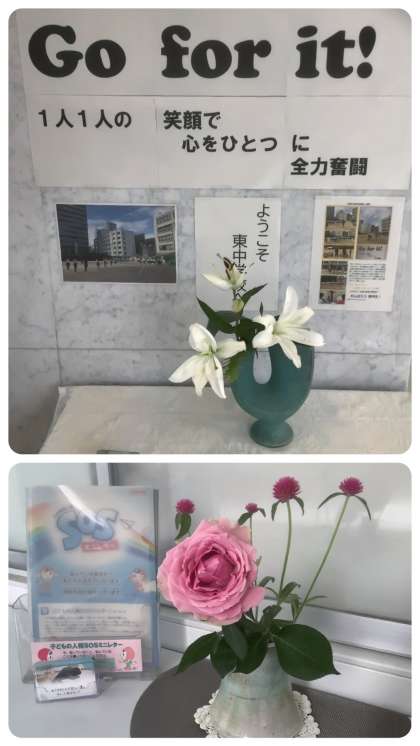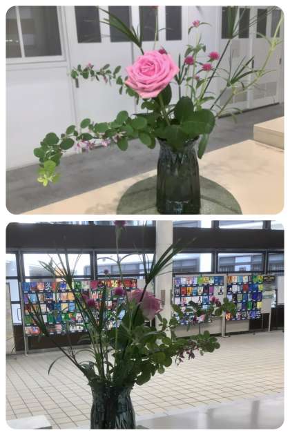 校内のお花を生け替え、また、整理していただきました。いつも東中生のためにありがとうございます。玄関ホールのお花は「かやつり草・千日紅・バラ・萩」、職員室前は「バラ・千日紅」です。バラが存在感を示していますが、それも他の草花があるから、より一層、バラの存在感が際立ち、見栄えします。