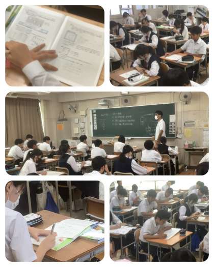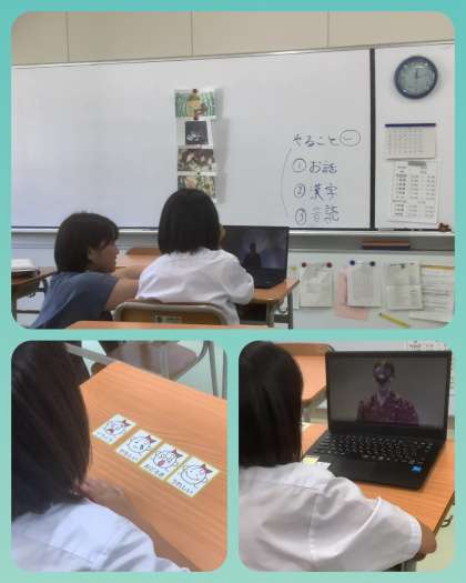 写真は、上から3年生の理科、2年生の英語、わかくさ学級の国語の様子です。