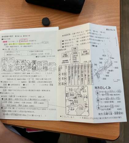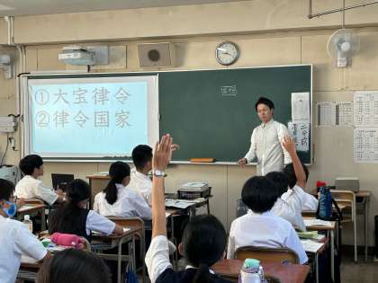 1時間目、1年5組の社会科の授業です。歴史で飛鳥時代を学びます。今の時代とかわらない法治国家が大宝律令によって制定された時代を、分かりやすく学んでいました。
