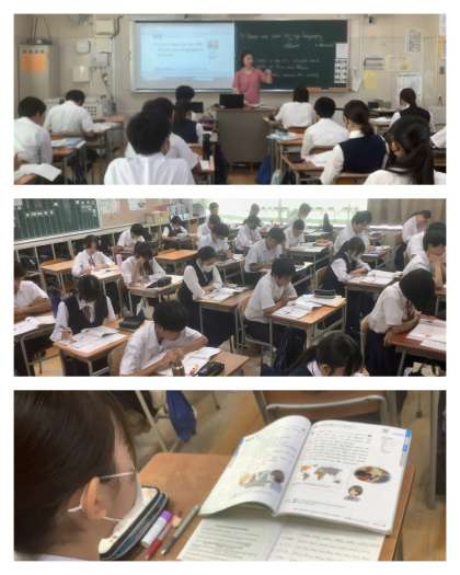 3年生の英語科の授業の様子です。3年間、このお二人の先生が、英語の授業を担当しています。生徒との良い関係が、教室の良い空気に表れているようです。ICT・プロジェクターを使っての説明の時間、ジェスチャーに合わせて英語で作文をつくる時間など、創意工夫した授業が展開されています。