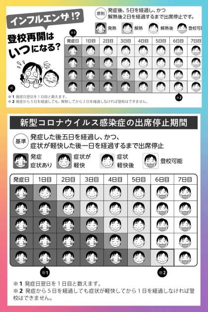 発症日を0(ゼロ)日目とし、5日を経過するまでは「必ず」出席停止です。「加えて」、インフルエンザは解熱後2日を、コロナは症状快活後1日を経過するまでは出席停止です。きちんと日数分をお休みいただくことが、感染拡大の抑制につながります。感染拡大の取組へのご理解とご協力をお願いします。