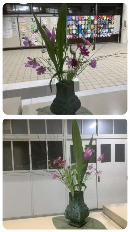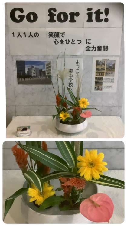 また、玄関入口とホール、職員室前のお花を生け替えていただきました。玄関入口には「秋色探し」のお題で「ススキ・鶏頭・ガーベラ・アンスリューム・ドラセナ」。玄関ホールには「ミズヒキ・ニセコバン草・百日草・クルクマ・コスモス」。職員室前には「百日草・マリーゴールド」。どれも素敵な花々です。いつも東中生のためにありがとうございます。生徒の皆さん、ご来校の皆さま、ぜひごゆっくりと鑑賞してください。