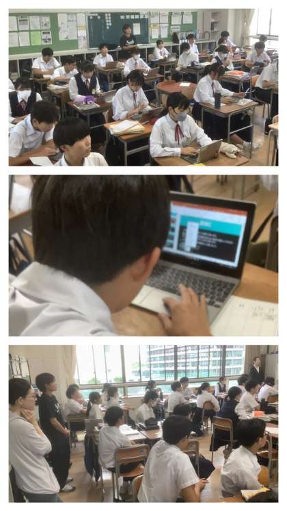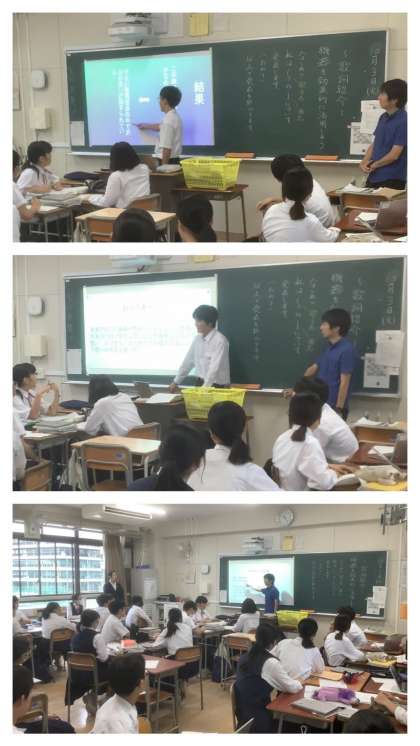 授業終盤では、代表生徒2人が、緊張しながらも、教室の皆さんの前で発表して、プレゼンの良い点を、学級全体で共有して授業の締めくくりとしました。
