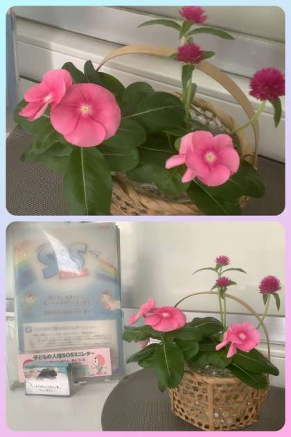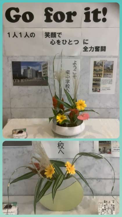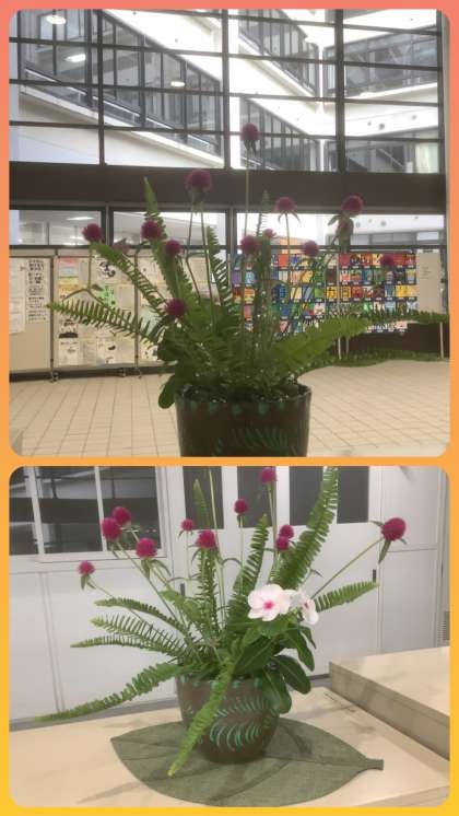 3連休明けに出勤すると、玄関のお花が整理され、ホールと職員室前のお花を生け替えていただいていました。いつも東中生のためにありがとうございます。ホールには「千日紅・たましだ」、職員室前には「日々草・千日紅」です。