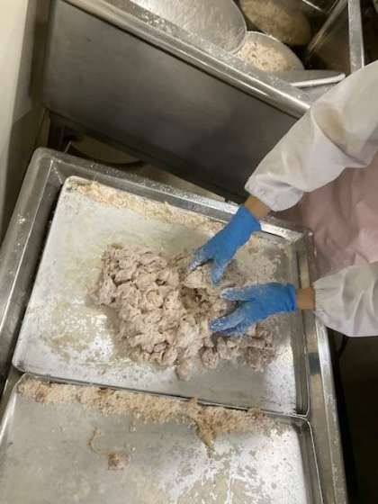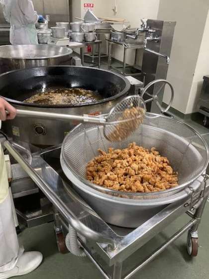 今日のメニューの1つは、生徒たちに大人気の「鶏肉のたつたあげ」です。