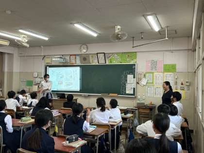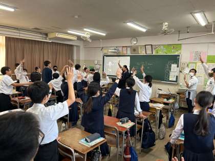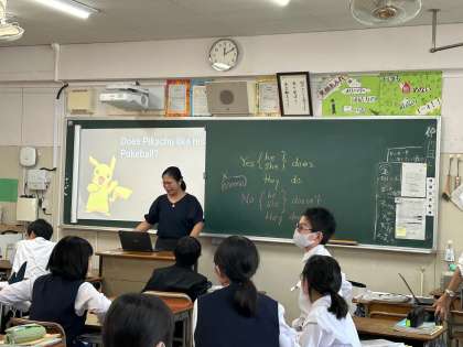 CーNETの先生とのティームティーチングの時間です。映像を出しながら、先生が質問をすると元気よく手をあげ「Yes,she does.」とみんなで答えて大盛り上がりでした!!