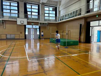 走り高跳びに挑戦しています。胸の高さぐらいに足を思いっきりあげて走ります。