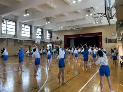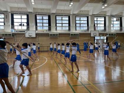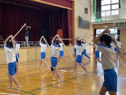 2年5.6組の保健体育の様子です。剣道の素振りを学んでいます。