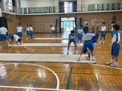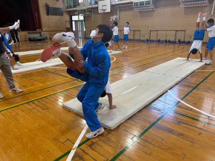 倒立からの前転、マット運動に取り組んでいます。まずは、周りの人に支えてもらいながらの倒立。それができれば1人で倒立!
