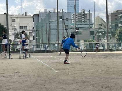 普段の練習の成果が出せず保守的な様子でした。練習の様子を思い出し、しっかり打ち込むこと、攻めることを話すと少しずつ足も動きトップ打ちやボレーで決めることができました。