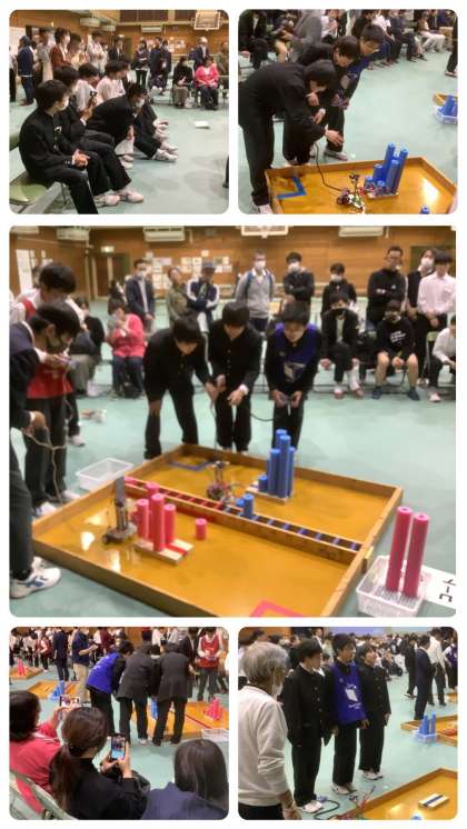 さて、6つのチームが参加した大会は、まずは「基礎部門」の予選リーグを勝ち抜けた1チームが決勝トーナメントに登場。ミッションであるポールは「2本vs2本」の同点。しかし、タイムアップの時に相手ロボットがポールを保持していたことにより加点され、残念ながら、東中チームは敗退となりました。決勝戦は兵庫県の同じ私立中学校のチームが対戦。実況と対戦後のインタビュアーは、本校の顧問の先生が担い、会場を盛り上げていました。
