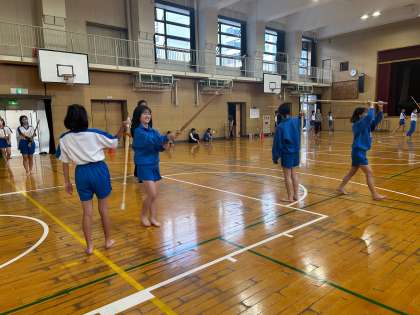 剣道の学習で、体育館に竹刀の音が響き渡っています。剣道部のお手本につづいて一生懸命に練習していました。