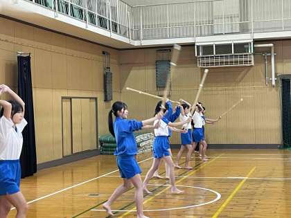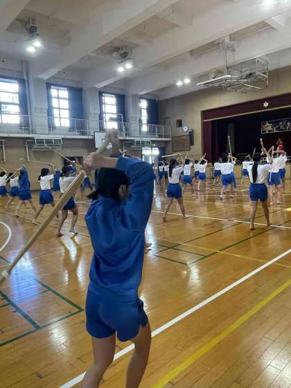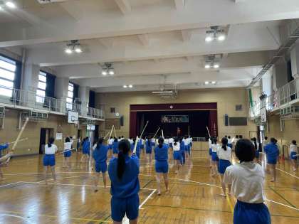 剣道を行っています。実際に竹刀を振りながら、礼儀作法を学んだり、面を打ったりしています。
