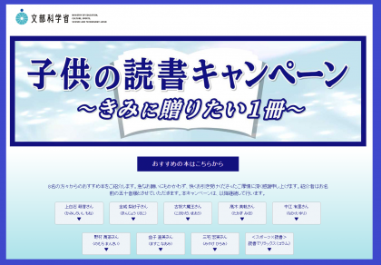 文部科学省特設ホームページ「子供の読書キャンペーン〜きみに贈りたい1冊〜」(こちらをクリックするとご覧いただけます。)